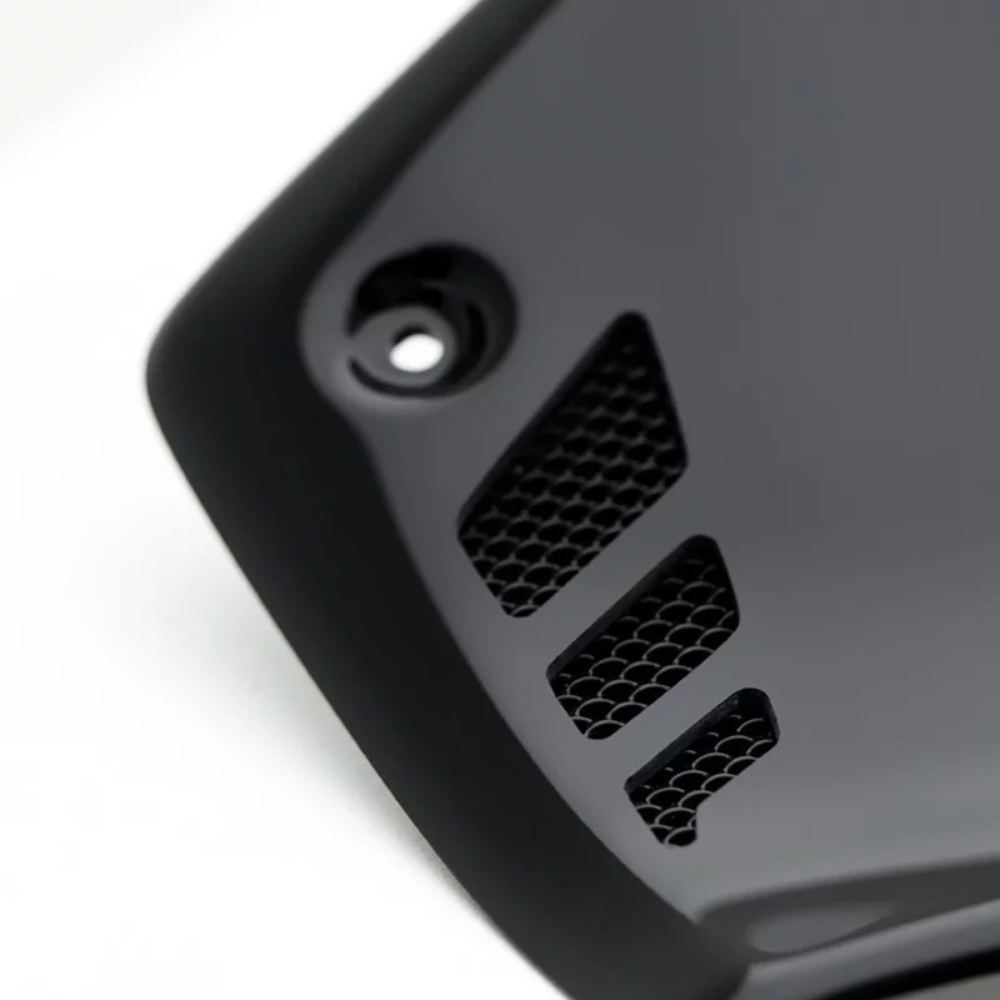 Fonctionnel : grille en aluminium intégrée pour améliorer l’apport en air frais au moteur.